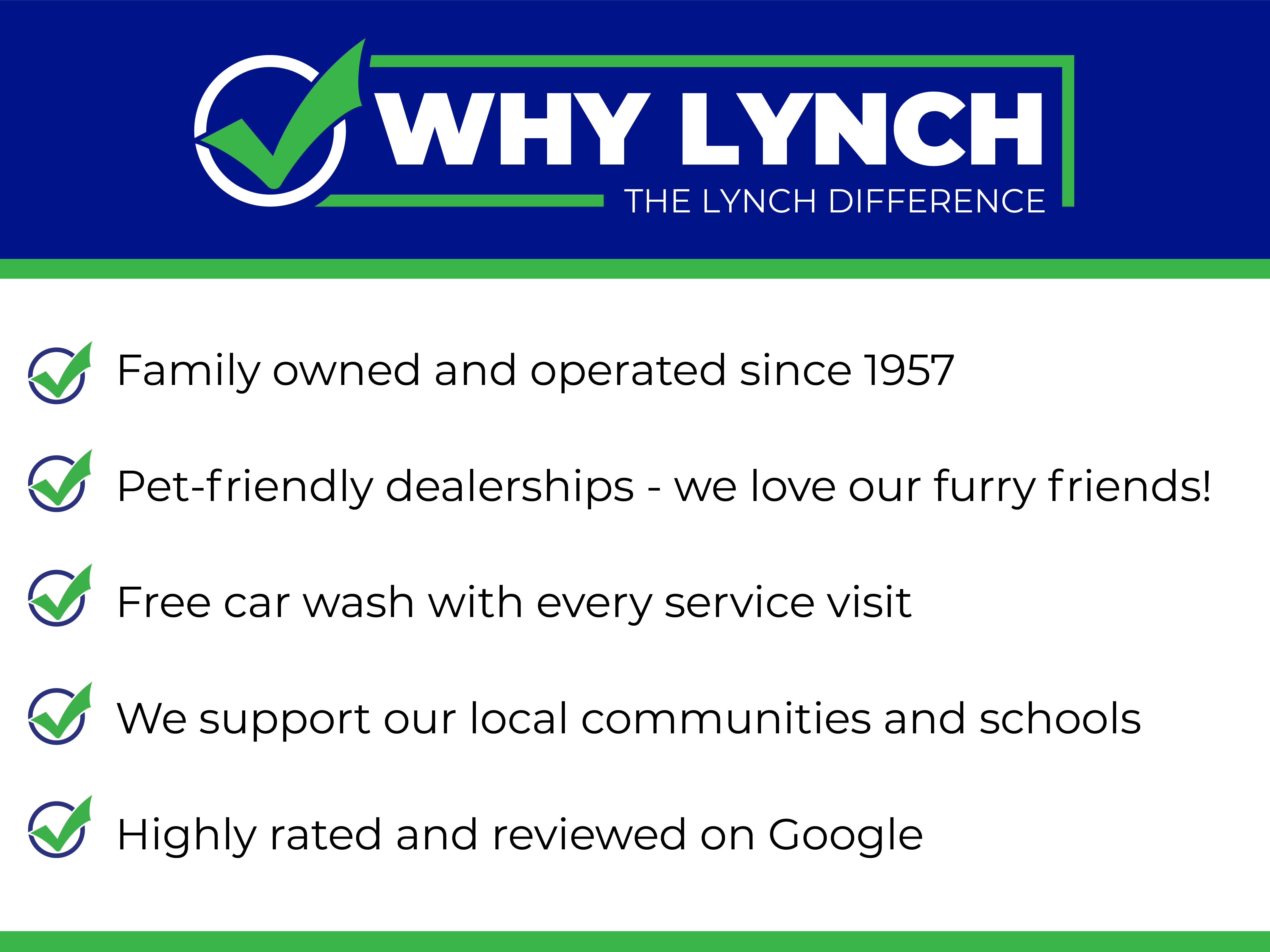 We strive to provide excellent customer service and the best car-buying experience. At our dealerships, we love our furry friends and offer pet-friendly environments, so bring your pet along with you when you come to visit us! With every service visit, you'll receive a free car wash, and with every vehicle purchase, you’ll Receive our Lynch Protect Program, which includes one year of Tire, Windshield, and Paint Protection. Lynch, has you protected! We are proud to support local communities and schools, and we have received excellent reviews on Google. For the best car buying experience, come to Lynch Family of Dealerships!
