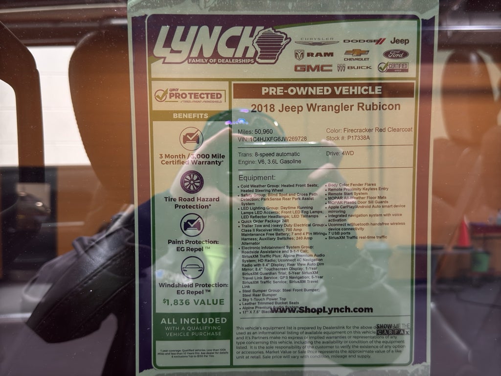 Ready for adventure and built to perform, this 2018 Jeep Wrangler Rubicon in Burlington, WI is your ticket to rugged capability and comfortable driving. Powered by a V6 3.6L gasoline engine and equipped with 4WD, the Rubicon tackles trails, snow and highways with confidence. This Jeep Wrangler pairs legendary off-road features with modern conveniences like Apple CarPlay for seamless smartphone integration and Automatic Climate Control to keep every ride comfortable.