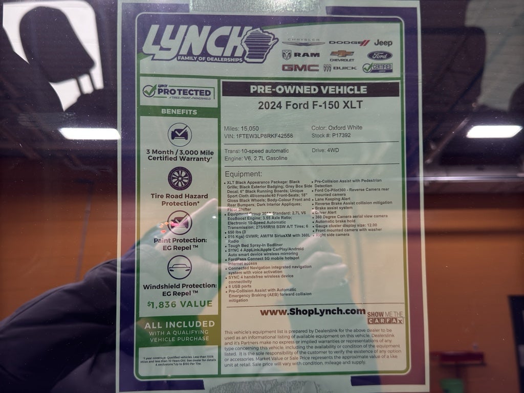 Drive home in confidence with this low-mileage 2024 Ford F-150 XLT, located in Burlington, WI. Powered by the efficient 2.7L V6 gasoline engine and backed by a capable 4WD system, this pickup blends everyday comfort with serious capability for work and weekend adventures. With only 15,050 miles, you're getting the benefits of a nearly-new truck without the new-vehicle price.