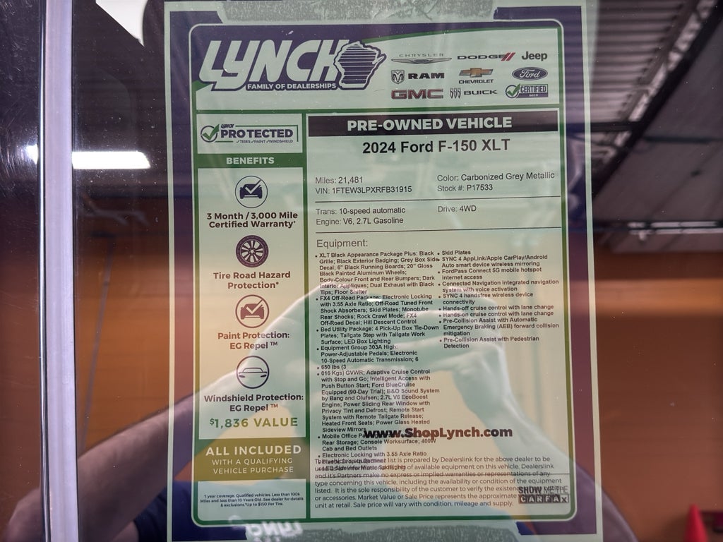 Schedule a test drive in Burlington, WI to experience the smooth V6 performance, comfortable leather seating, and tech-forward interior firsthand. With low mileage and the best price locally, this 2024 Ford F-150 XLT is ready to earn its place in your driveway. Contact us to arrange a viewing or learn more about financing options.