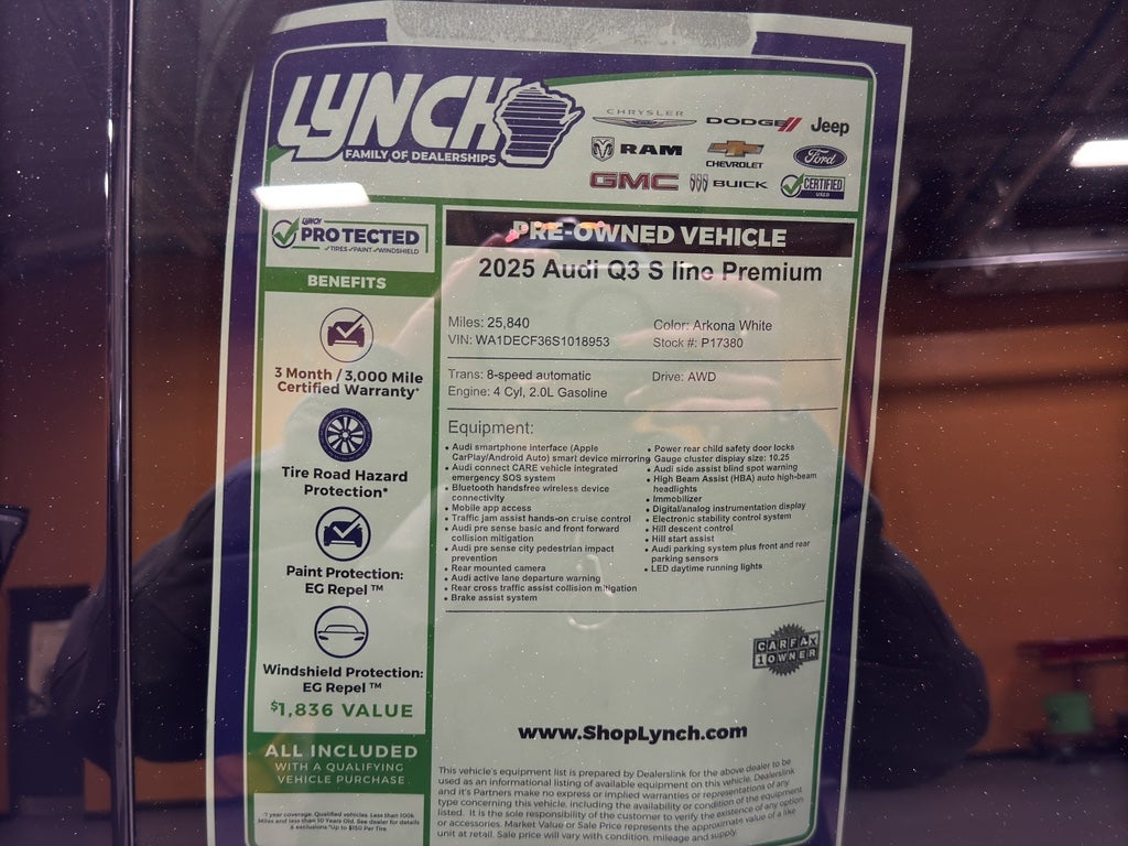 2025 Audi Q3 S line Premium – AWD, 2.0L 4-cylinder, 25,840 miles. Located in Burlington, WI, this premium compact SUV pairs sporty S line styling with Audi's refined driving dynamics and a fuel-efficient 2.0L gasoline engine. With low mileage for its model year and a CARFAX 1-Owner history, this Audi Q3 delivers excellent value and peace of mind.