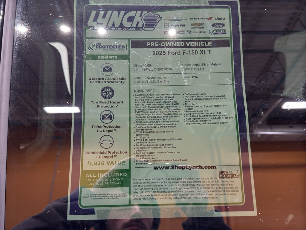 2025 Ford F-150 XLT — 4WD, V6 3.5L, 10,084 miles. Located in Burlington, WI, this well-maintained Ford F-150 XLT delivers capability, comfort, and value for buyers seeking a dependable pickup with low mileage and the best price in the area. The robust 3.5L V6 gasoline engine and four-wheel drive provide confident towing and traction for worksite demands or weekend adventures across Wisconsin seasons.